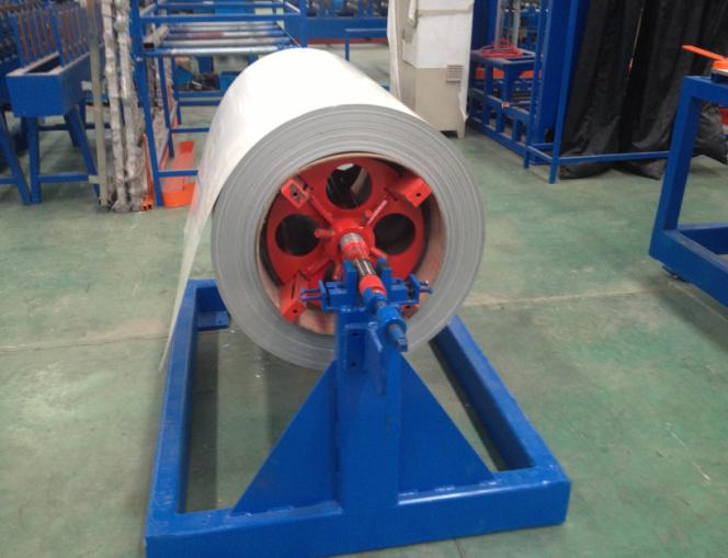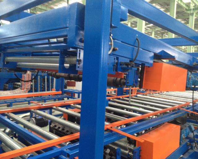 主要由瓦楞板壓型機和彩鋼復合機組成,可以一次性制做墻面彩鋼夾芯板或屋面彩鋼夾芯板,并且瓦楞板壓型機和復合機可以獨立生產。整條流水線壓型部分由彩鋼板開卷機、冷彎成型主機、切斷裝置組成,復合機部分由彩鋼板開卷,EPS板或巖棉板輸送,墻面淺波峰壓制,混合涂膠、加溫加壓、復合、平板卷邊、企口板翻邊、開槽、整邊、氣動夾緊、自動覆膜、自動切割、成品拖架組成;
